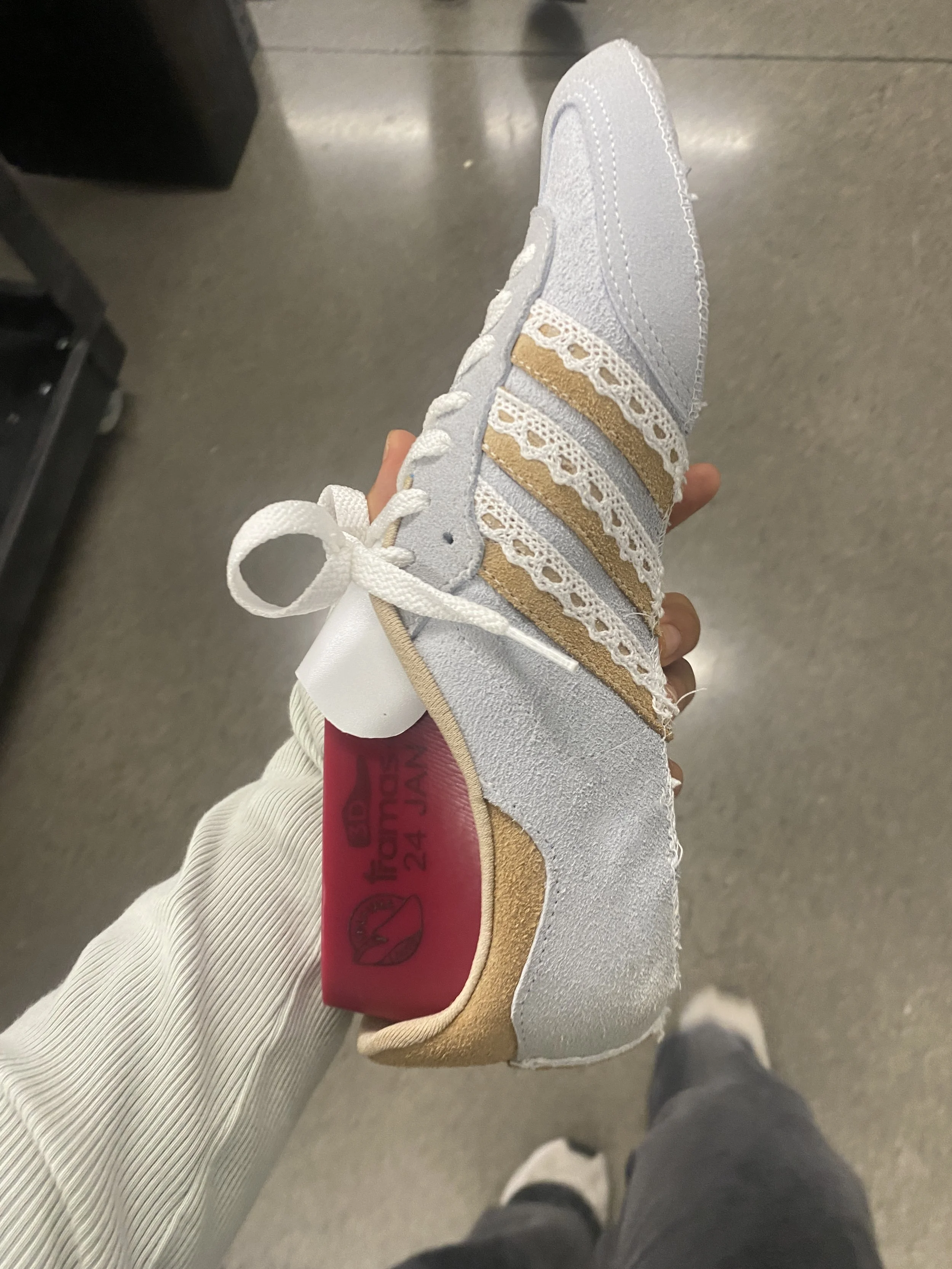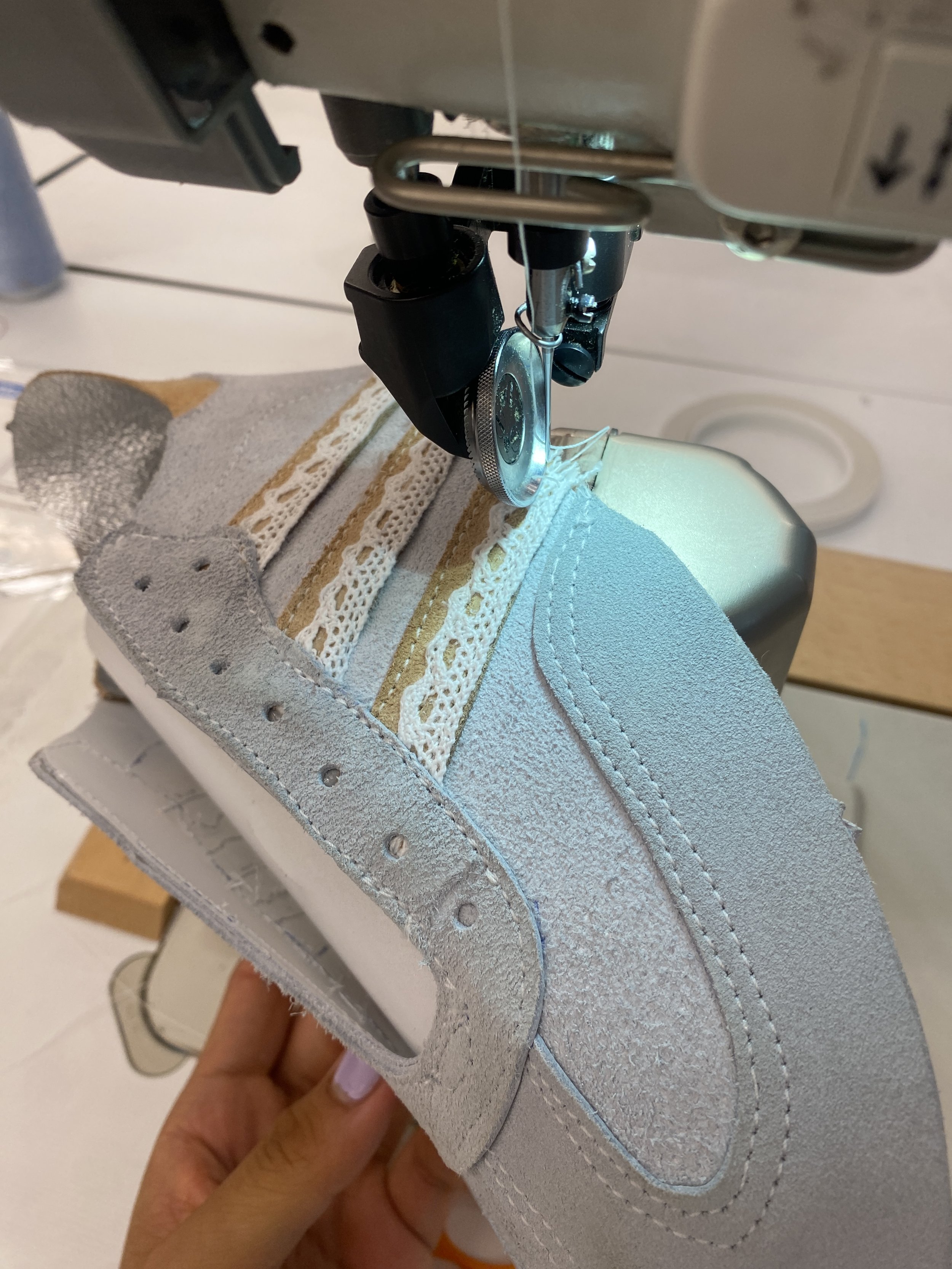 I originally selected blue suede for accents, metallic silver for the stripes and mustache, and a shiny white (in the tongue) as the main body. But the white looked too much like a superstar so I flipped it and the back (a light blue) looks like a suede which is what I ended up using. Thankfully, the color matched the blue suede I chose for the toe cap and accent pieces. Because of this choice, I flipped the stripes backwards too so the brown is actually the metallic material seen above. To add the lace detailing inspired by Wales Bonner, I put lace over the stripes and compliment the sole. I wanted a feminine piece so the light blues and lace really brought out a softer side to this shoe.